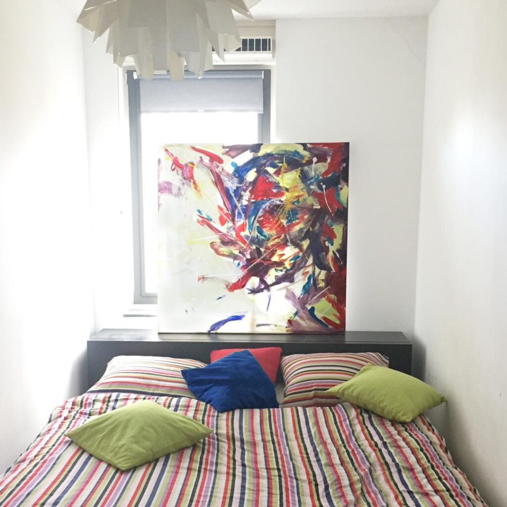 Omdat ik met “mixed media’ werk, waaronder minuscule draadjes, wol, stukjes tissuepapier en meerdere lagen verf, is het onmogelijk om de essentie, subtiliteit en diepte van mijn werk in één enkele foto vast te leggen. Om een beter idee te krijgen van mijn kunstwerken en hun elementen, vind je hieronder enkele foto’s van mijn kunstwerken op locatie. Wil je de gelaagdheid van mijn werk wat beter bekijken, neem dan even een kijkje bij naar Close-up.